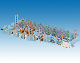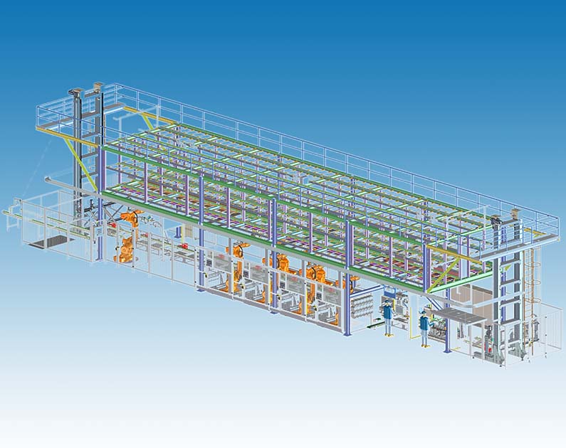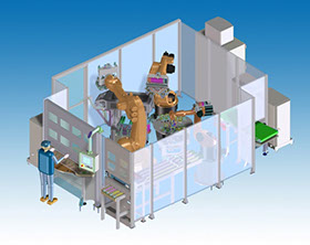 Robotergestützte Fertigungslinie zur automatischen Bearbeitung (Stanz-, Klebe- und Schraubprozesse) von Stossfänger-Verkleidungen, Taktzeit ca. 40 Sek.